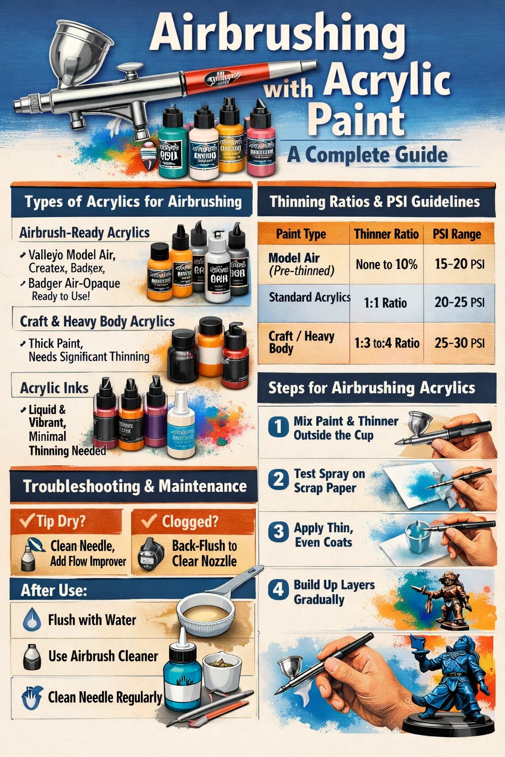 Használata desztillált víz elfogadható alapritkításhoz, de dedikált Airbrush hígító felsőbbrendű. Ezek a hígítók "folyásjavítókat" és "lassítókat" tartalmaznak, amelyek lelassítják a száradási időt. Ez létfontosságú, mert az akrilok párologtatással kiszáradnak; retarder nélkül a festék megszáradhat a tű hegyén, mielőtt még elhagyná a festékszórót, ezt a jelenséget ún. "végszáraz".