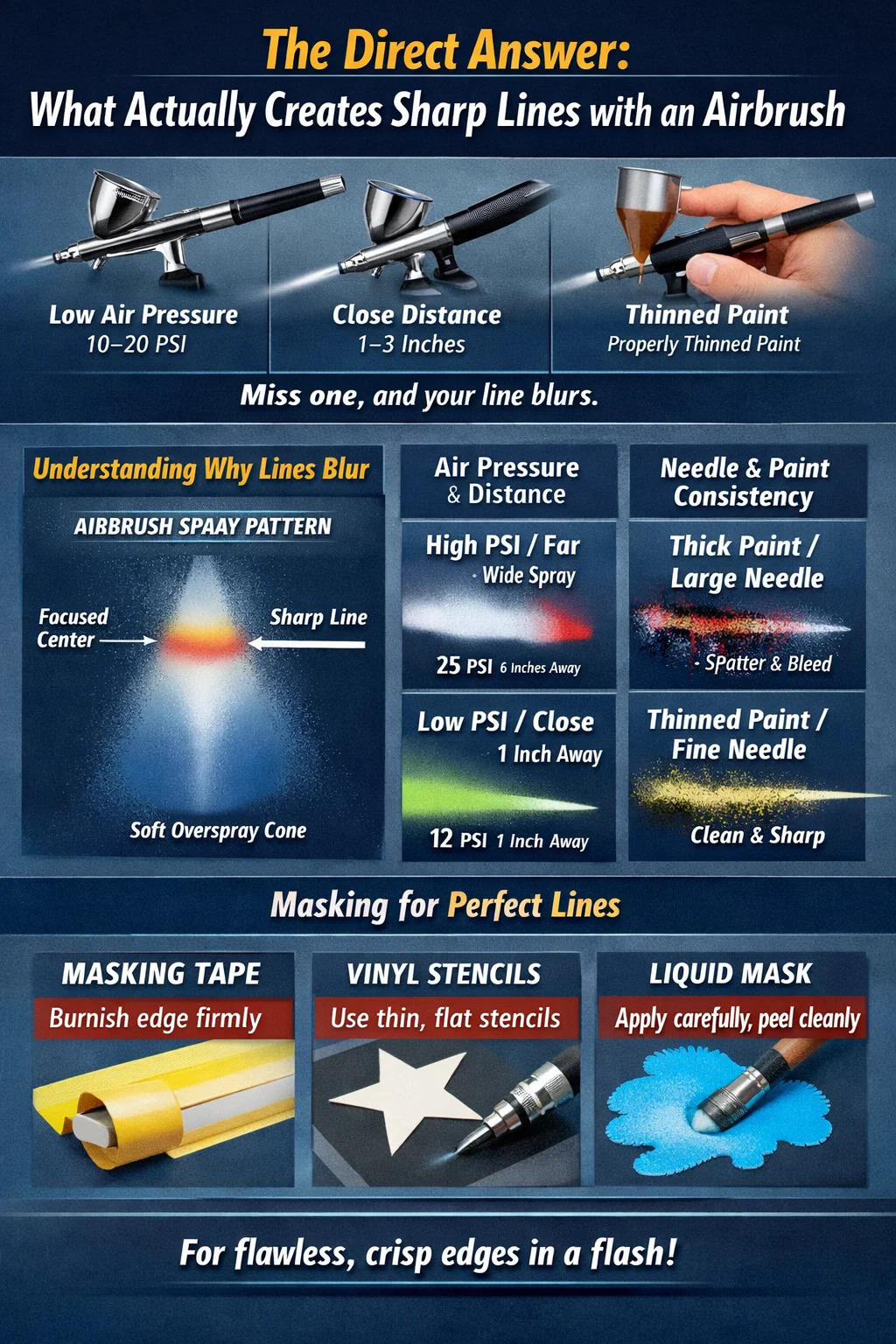 Az éles vonalak egy festékszóróval négy alapvető változóra vezethetők vissza, amelyek együtt működnek: alacsony légnyomás (általában 10-20 PSI) , közeli munkatávolság (1-3 hüvelyk a felülettől), megfelelően hígított festék és szándékos kioldóvezérlés. Ha még egyet is kihagy ezek közül, a vonal meglágyul, vérzik vagy fröcsköl. A legtöbb kezdő azért küzd, mert túl messze dolgozik a felszíntől és túl nagy nyomást gyakorol – ez a két szokás azonnal megöli a pontosságot.
