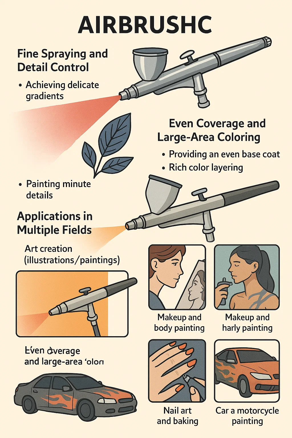 --Egyenletes alapréteg biztosítása: Az airbrush-ok rendkívül egyenletes színfedést biztosítanak nagy területeken. Ez hatékonyabb és simább, mint a hagyományos kefék a hibátlan felületet igénylő tárgyak (például modellek, autók és bútorok) létrehozásához.